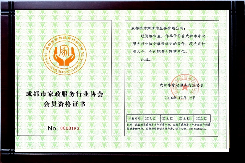 成都市家政服務(wù)行業(yè)協(xié)會(huì)會(huì)員資格證書(shū)
