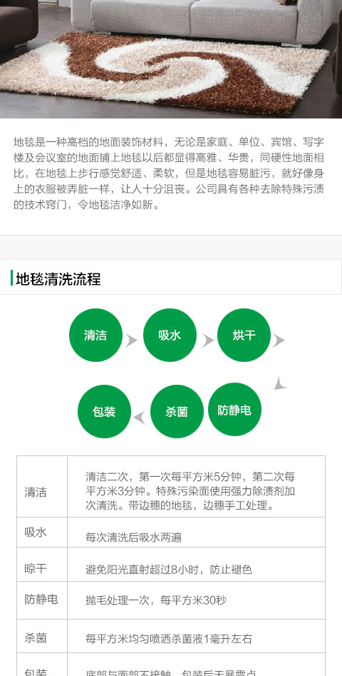 清潔二次,第一次每平方米5分鐘,第二次每平方米3分鐘。 每次清洗后吸水兩遍。晾干——避免陽光直射超過8小時,防止褪色。防靜電——拋毛處理一次,每平方米30秒。 殺菌——每平方米均勻噴灑殺菌液1毫升左右。包裝——底部與面部不接觸,包裝后無任何暴露點。
