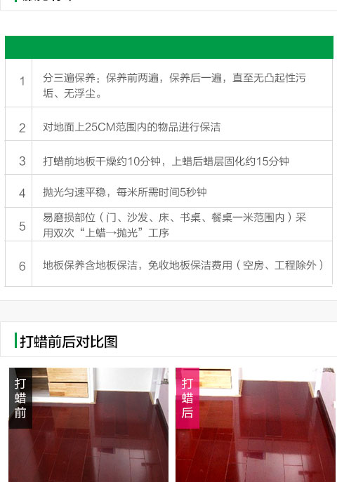 保潔三遍(保養(yǎng)前兩遍,保養(yǎng)后一遍),直至無凸起性污垢、無浮塵;地面以上25cm范圍內(nèi)物品保潔。
